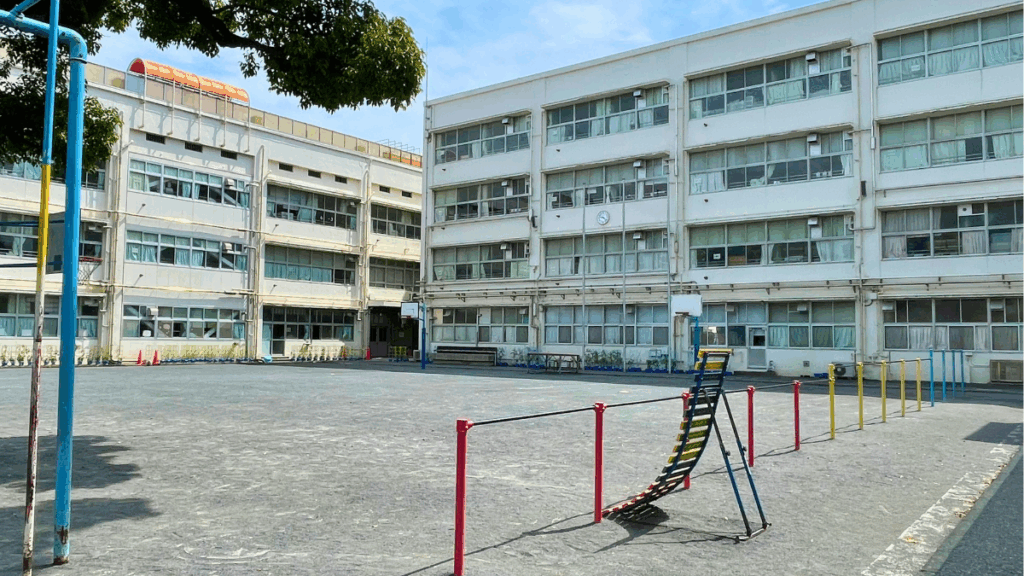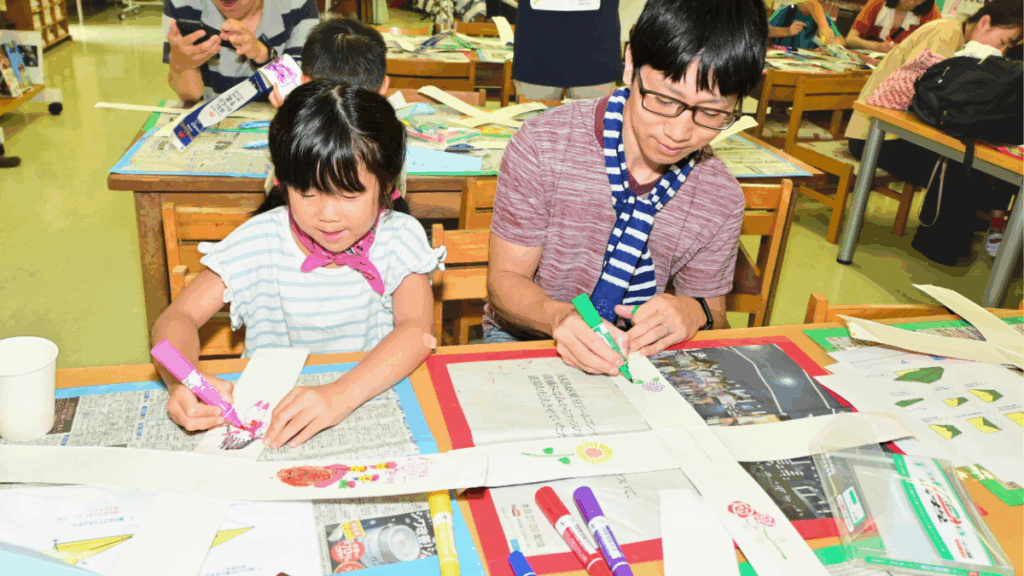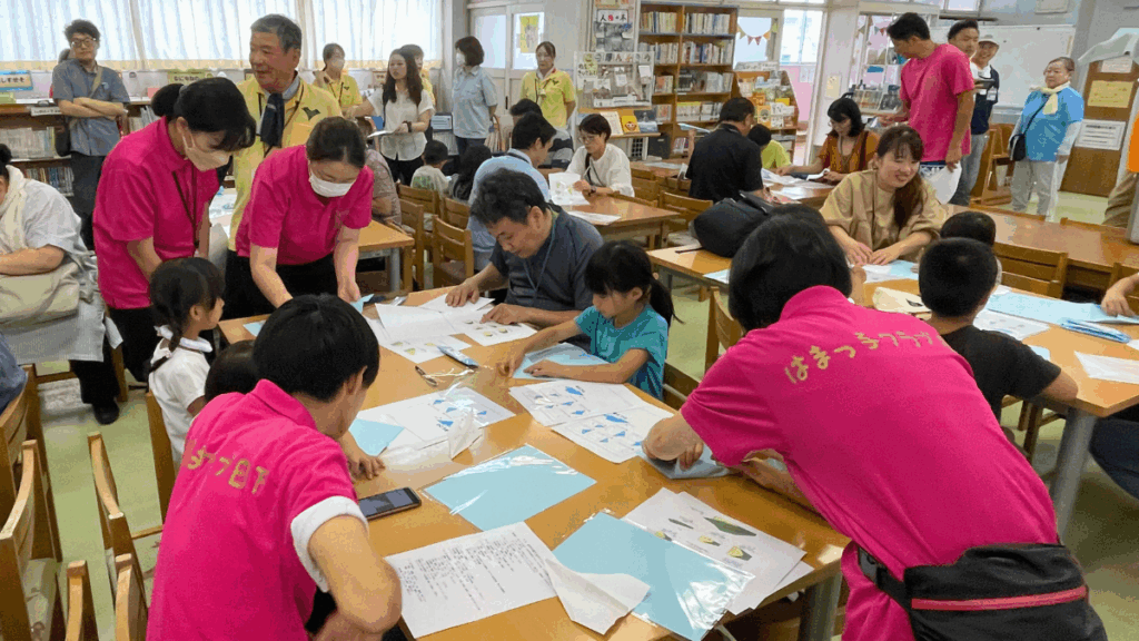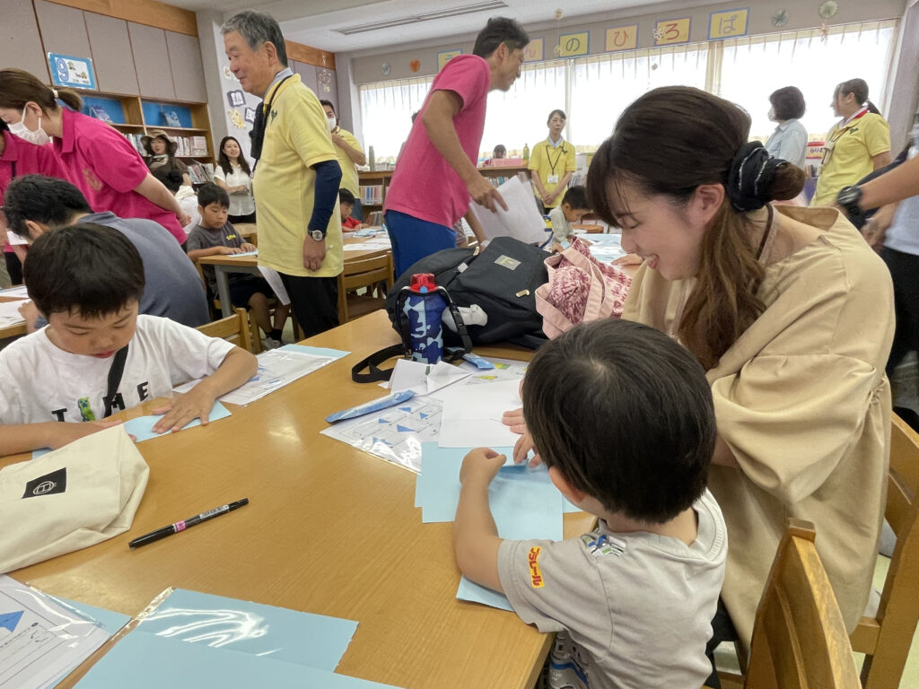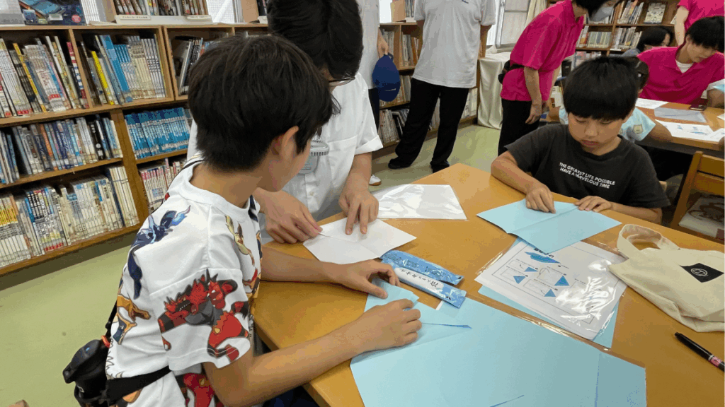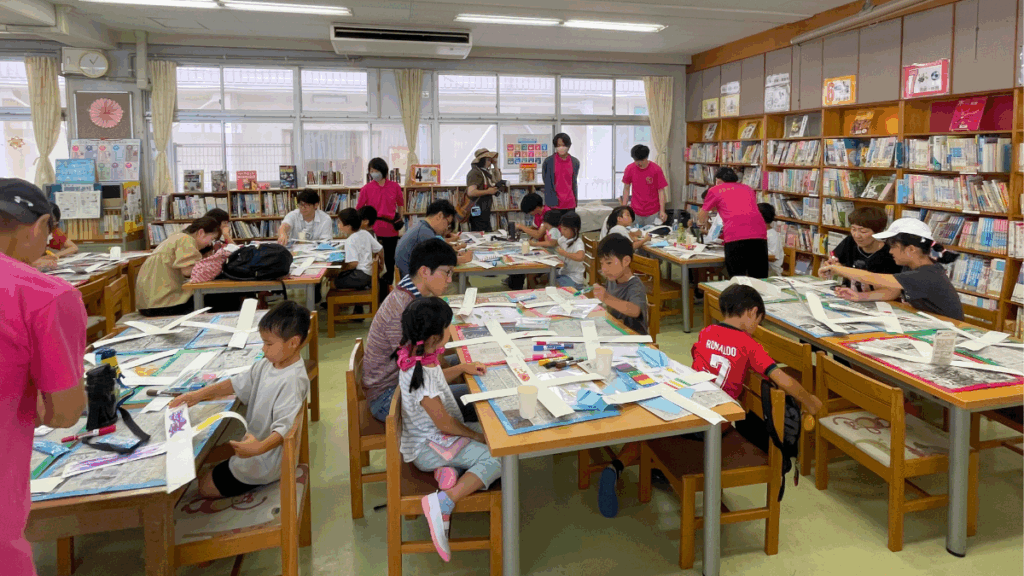 紙ひこうき大会&エコクラフトの会場は日下地区にある日下小学校でした。紙ひこうき大会は体育館で、紙ひこうき制作とエコクラフト制作の会場は図書室で行います。大会当日はとても暑い日で体調が心配でしたが、制作は涼しい図書室内で行うとのことで安心しました。