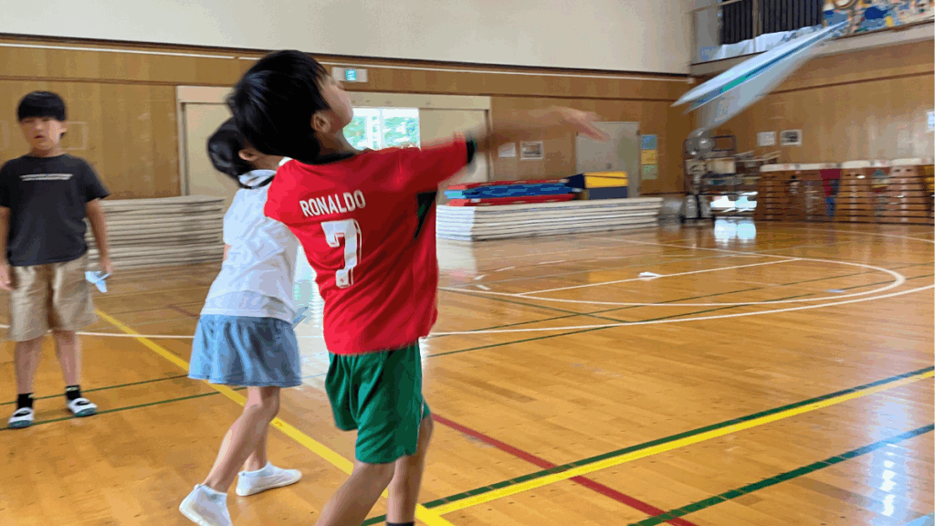 紙ひこうきが完成したら、体育館に行き紙ひこうきを飛ばす練習の時間です。子どもたちは大きく振りかぶって力一杯飛ばしていました。