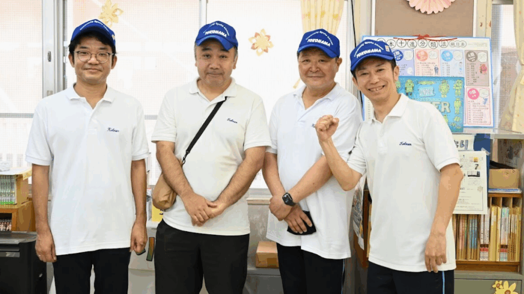 左から日下地区スポーツ推進委員連絡協議会 関口会長、日下地区青少年指導員連絡協議会 佐々木会長、日下連合町内会 田口会長、田口会長のお孫さん、はまっこSKY代表 田口恭平さん