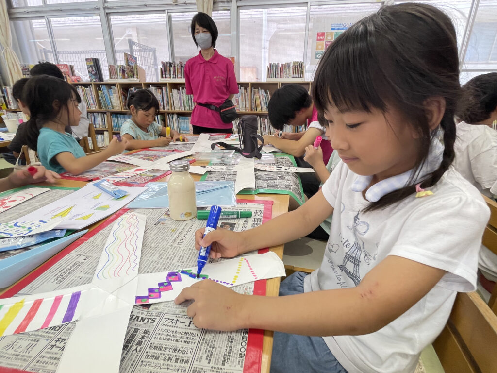 紙ひこうきを飛ばし終わった人は、会場を移動しエコクラフト「牛乳パックのちょうちん作り」に取りかかりました。みんなどんな絵を描くか考えていました。今回初めて参加していた小学2年生の女の子は、自分で考えたデザインをもくもくと描いていました。とても色鮮やかですね。