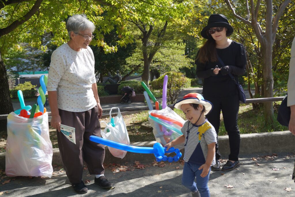 今回の公園あそびでは、ご近所にお住まいの方が、港南区民活動支援センターの街のアドバイザーに教わって身につけたバルーンアートをたくさん作って届けてくれました。