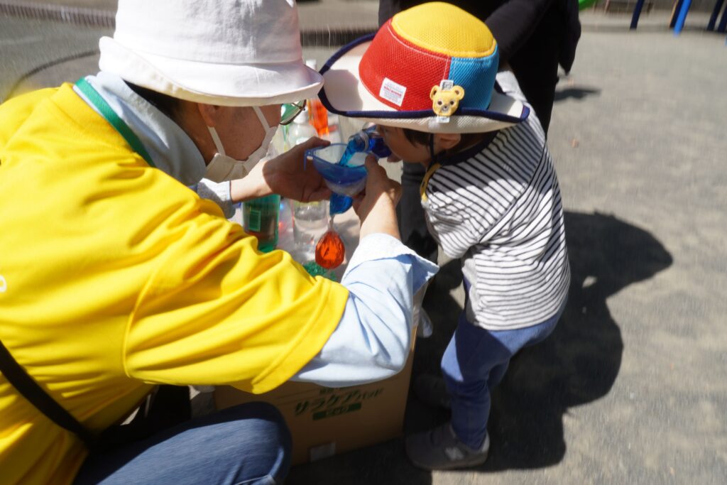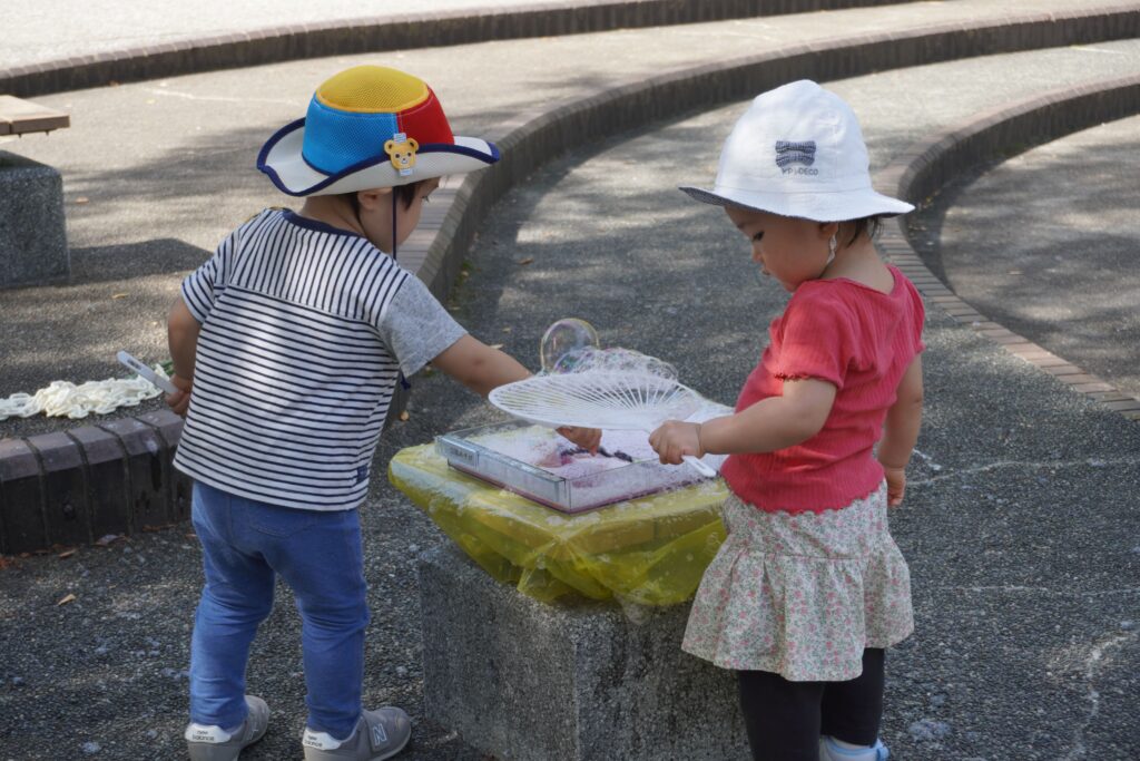 スタッフさんお手製のシャボン玉道具を用意すると、子どもたちは楽しそうに遊び始めます。