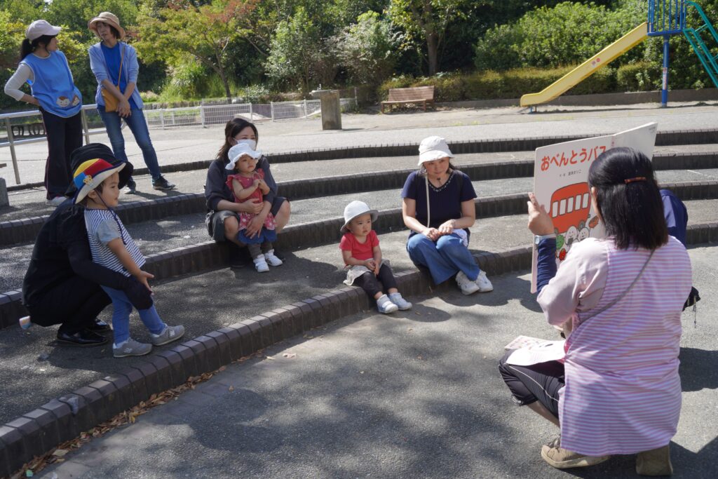 近くの幼稚園や保育園の地域担当の先生たちが公園あそびに加わることもあります。この日は、絵本を使った読み聞かせをしてくれました。