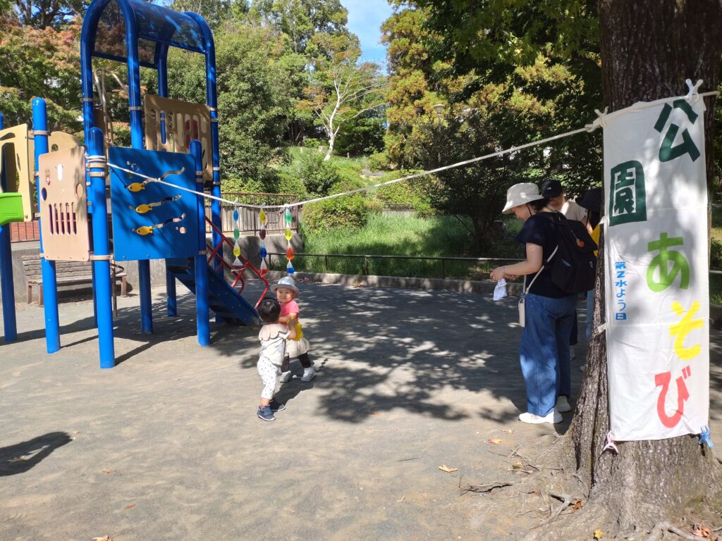 複合型遊具の近くにある木に「公園あそび」と書かれた旗が設置されて、周りで遊んでいる子どもたちやお散歩中の方々に声をかけながら、野庭中央公園の一角でゆるやかに公園あそびが始まりました。