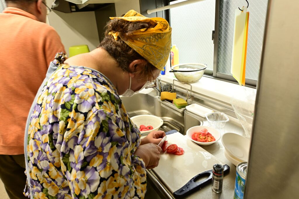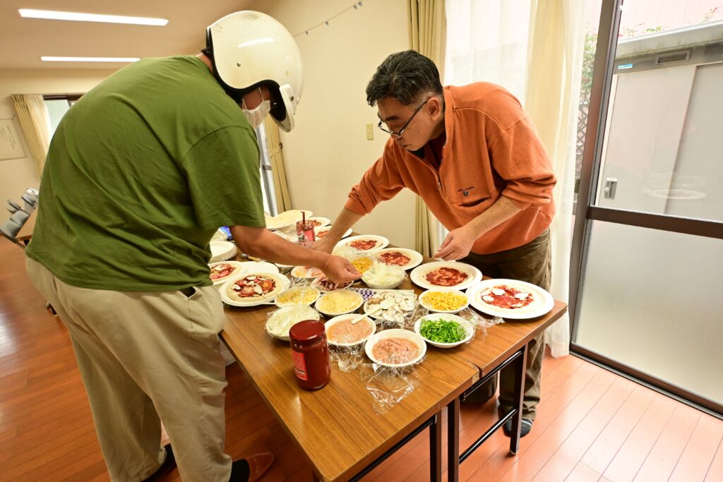 参加者が集まる前、会場の中にある台所では、自治会の人たちが和気あいあいとピザのトッピングを準備してくれていました。