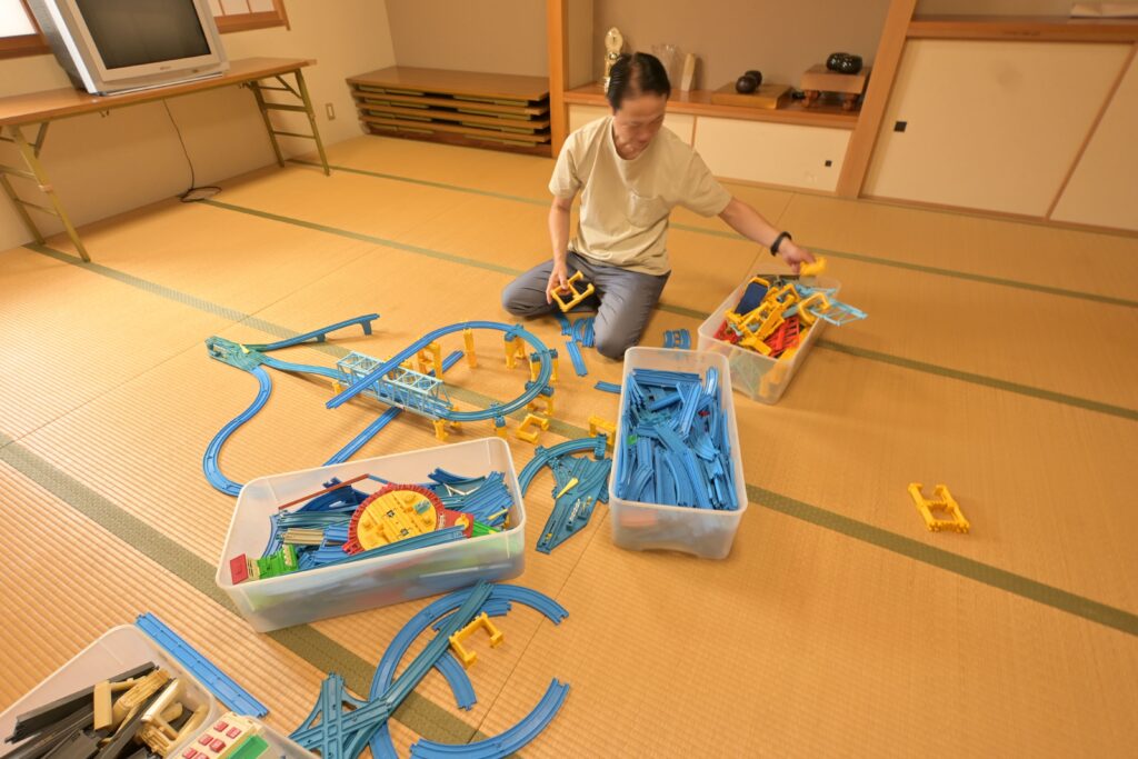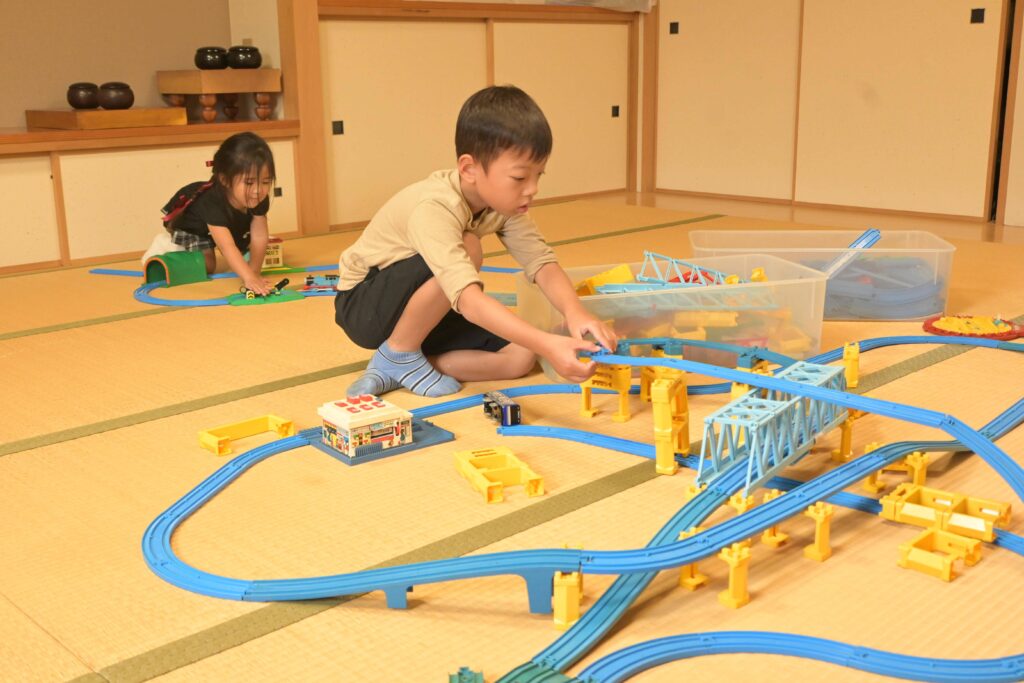 2階では、会長が持参したプラレールが用意されていました。参加者が集まる前に会長自ら準備を行い、子どもたちを楽しませようとする温かい心づかいが感じられました。