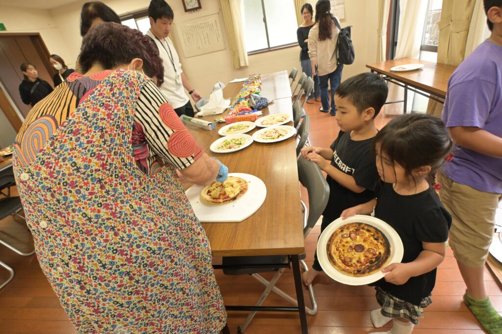 焼きあがったピザを食べやすい大きさにカットし、会館内でいっしょに食べます。自分で作ったオリジナルピザを受け取った子どもたちは、嬉しそうに見せ合っていました。