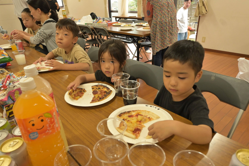 ピザだけでなく、ジュースやお菓子なども用意されていて、参加者たちは食事をしながらおしゃべりを楽しんでいました。
