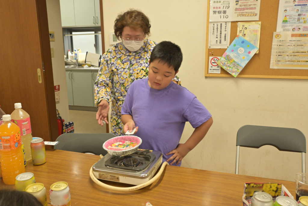 会館の中では、ガスコンロを使ったポップコーン作りも体験できました。子どもたちは、パチパチとはじける音に大興奮でした。