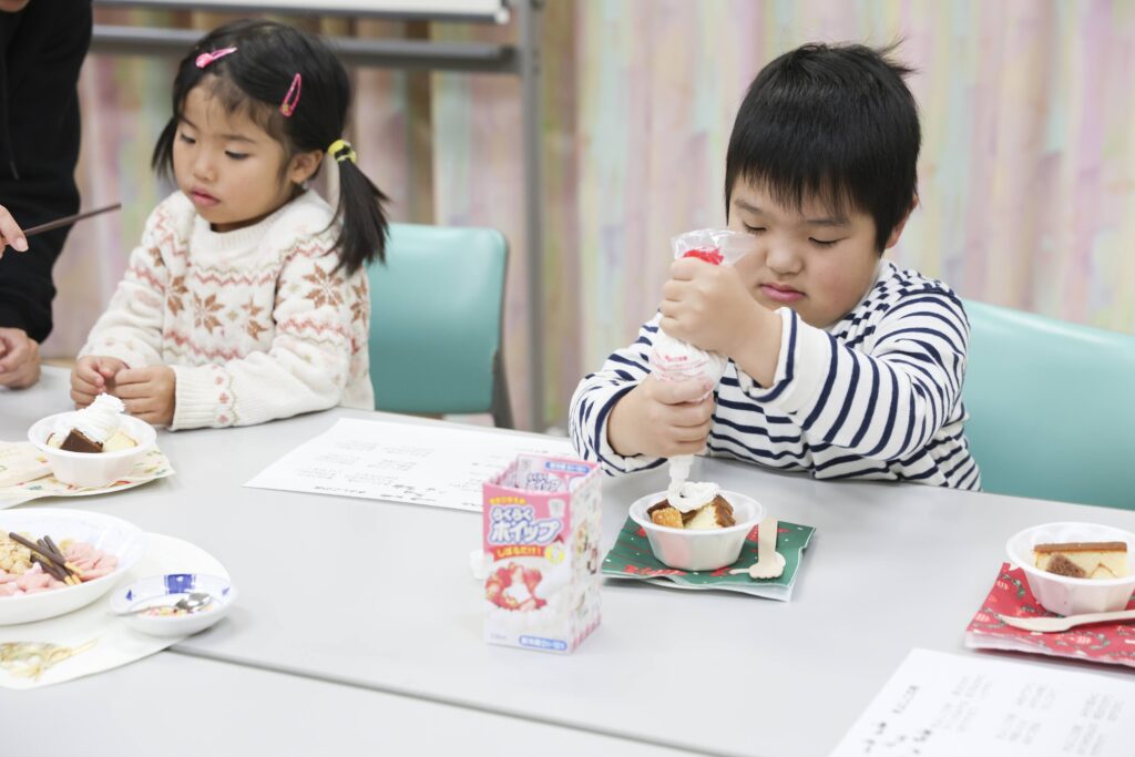 「みんなでケーキ作りをゆっくり楽しみましょう。」の声で、いよいよ楽しみにしていたケーキ作りが始まりました。誰でも簡単に作ることができるように、カットされたカステラケーキがテーブルに配られました。子どもたちが、早速ホイップクリームをしぼっていきます。