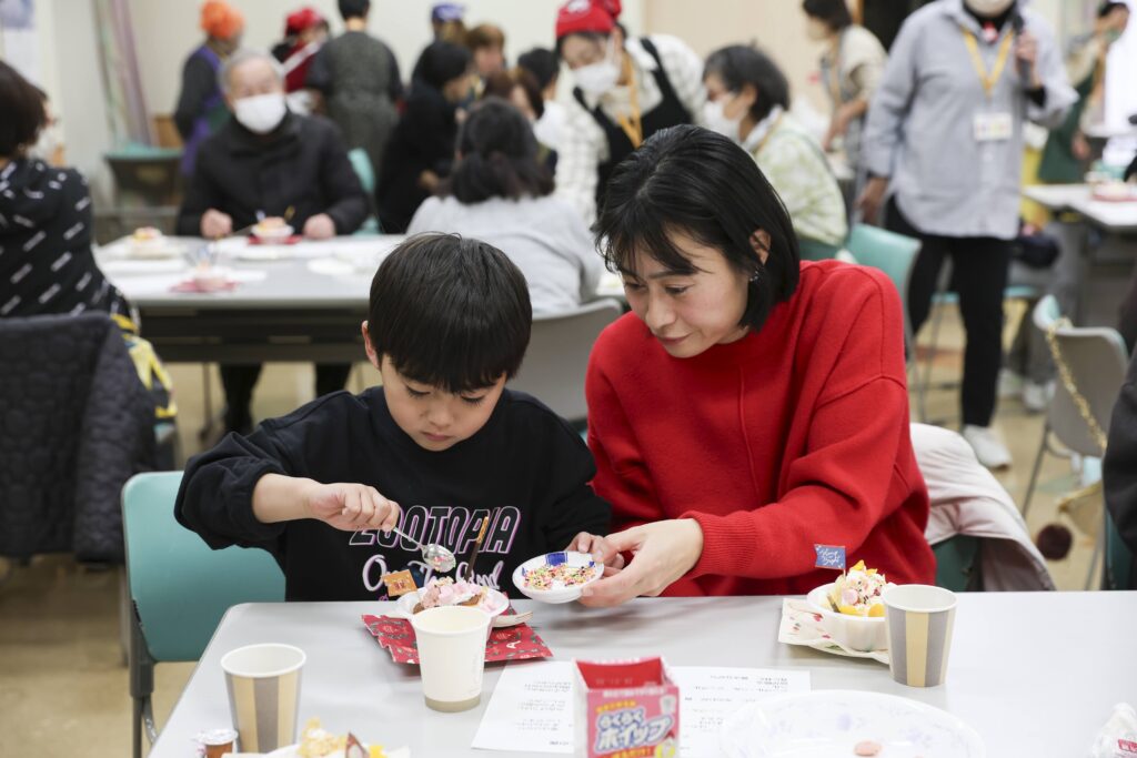 各テーブルに分かれ、民生委員さんがそれぞれ着席し、子どもたちのケーキ作りをお手伝いしていました。1人で作ってもいいし、難しければ同じ地域に住むみなさんがサポートしてくれるので安心ですね。