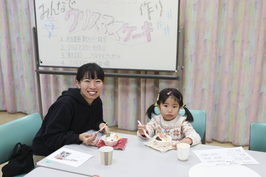 子どもたちは、できあがったケーキを見て「かわいくできたね!」と周りの人たちに話しかけられて、にこにこと食べていました。ママやパパは、子どもたちがケーキを作っている姿を嬉しそうに撮影しているのが印象的でした。