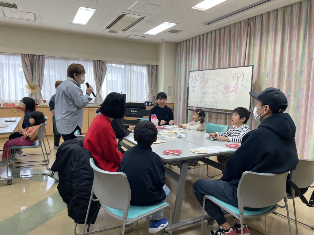 クリスマスの飾り付けがされた室内には、クリスマスソングが流れ、参加者が次々と席に着きました。高齢者や親子はテーブルに用意されたクリスマスデザインのナフキンに「かわいいね。どんなケーキを作るのかな?」などわくわくしながら会話をしています。